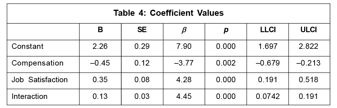 Table 3 shows that the interaction effect between compensation and job satisfaction is significant and that job satisfaction moderates the relationship between compensation and retention.