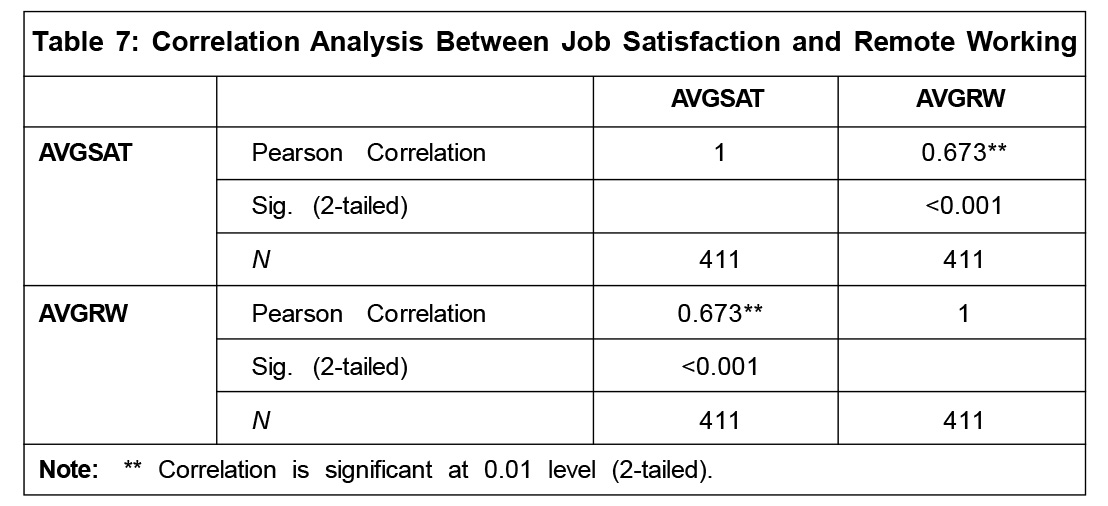 The results show that job satisfaction and remote working are significantly correlated (Table 7).