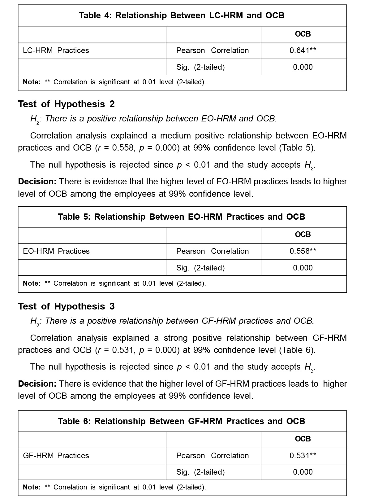 Correlation analysis is used to measure the magnitude and the direction of the relationship between the two variables. The correlation coefficient, denoted by "r", measured the closeness of the relationship between the two variables. It contains the following features. The value "r" lies between -1 and +1. The closer the coefficient is to an absolute value of one (1.00) indicates a perfect correlation, and a value near zero (0.00) indicates a very weak linear relationship. The magnitude of "r" indicates the strength of the linear relationship, while the sign indicates the direction. The authors have used correlation analysis to examine the relationship between SR-HRM and OCB in the selected manufacturing company in Nuwara-Eliya district of Sri Lanka.