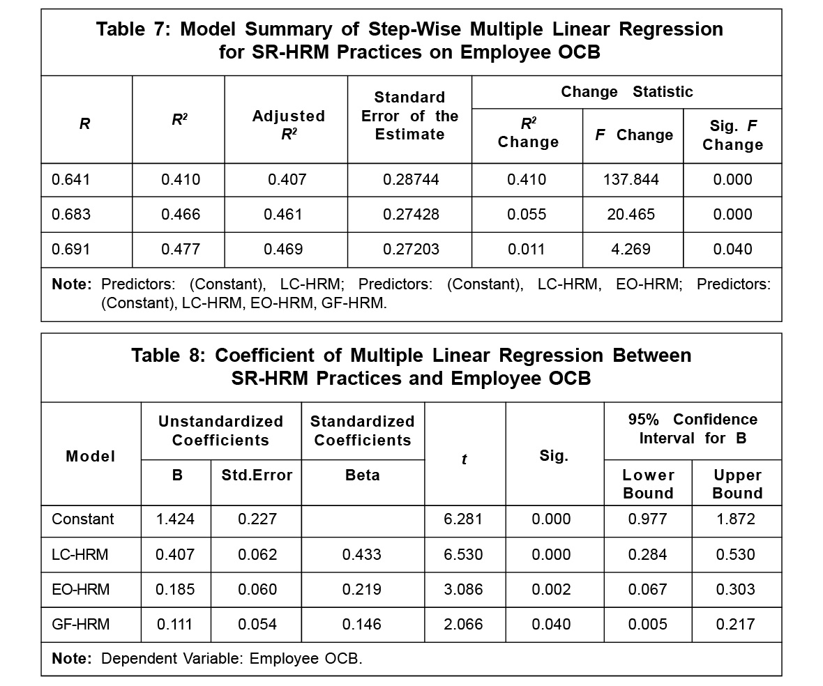 The study used multivariate analysis to measure the impact of SR-HRM practices on employee OCB. Moreover, to analyze the impact of each dimension of SR-HRM on employees, step-wise multiple regression analysis was used. The results are shown in Tables 7 and 8.