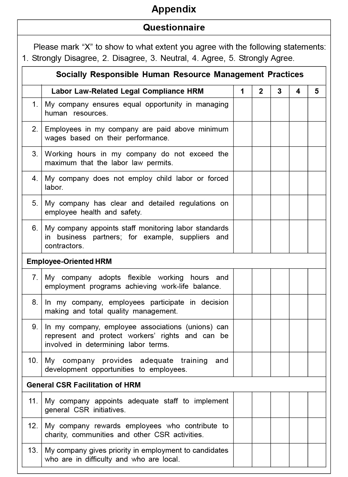 This study has used an instrument adapted from past research works of Shen and Zhu (2011). This instrument can be used to measure the SR-HRM practices that consist of 13 question items. This instrument had a Cronbach's alpha of 0.847, which is higher than 0.70. Hence, this instrument has good reliability. To measure OCB, 24 question items were used from past research works of Organ (1988); Jiao et al. (2011); and Oge et al. (2014). The instrument had a reasonable degree of reliability with a Cronbach's alpha of 0.926. This study has used a Likert scale ranging from 1 to 5, where 1 indicates "strongly disagree" and 5 indicates "strongly agree", with the mean scores indicating the status of the study variables.