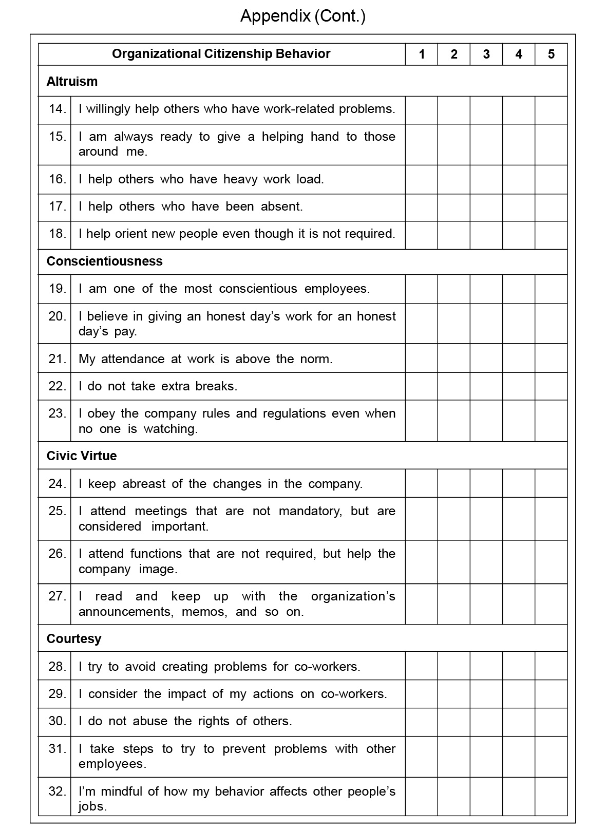 In recent years, OCB has become one of the most widely researched areas in organizational behavior research. OCB is regarded as one of the most desirable workplace behaviors expected from employees to ensure superior organizational performance. Researchers pointed out that OCB should be a significant factor in an employee's job performance (Podsakoff and Mackenzie, 1997; Khaola, 2014; and Basu et al., 2017). Due to the apparent relevance of OCB, businesses are focusing their efforts on improving OCB among employees to accomplish organizational goals and objectives more effectively and efficiently in today's competitive business environment.