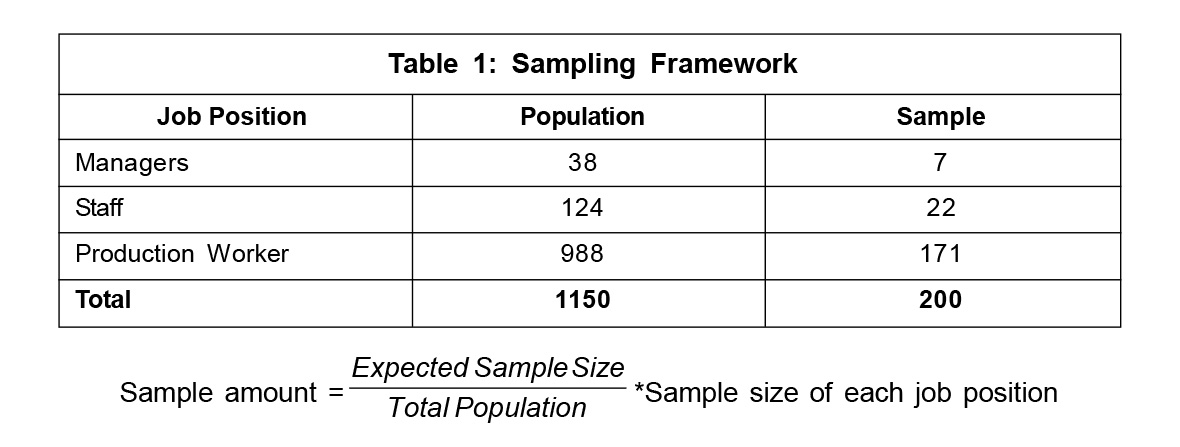 The empirical data for the current study was collected from a manufacturing company operating in Nuwara-Eliya District of Sri Lanka. The total population for the study was 1,150 employees of the selected manufacturing company. Out of these, 200 employees were selected as the sample to conduct the study by using disproportionate stratified sampling method. Table 1 describes the sampling framework of the study. The following equation was used to calculate the sample size.