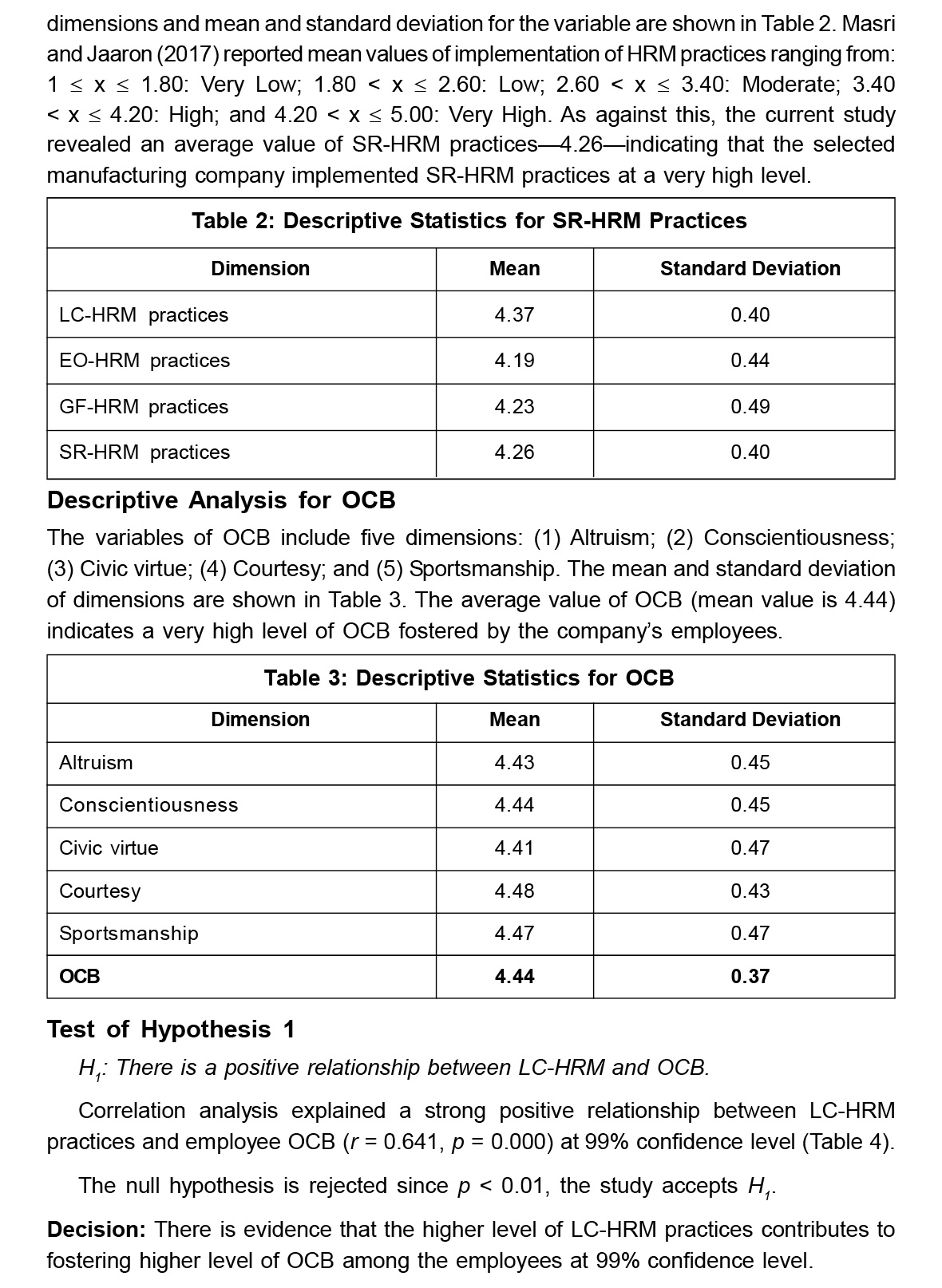 Limitations and Future Scope: The current study is a cross-sectional one. As a result, future researchers should confirm the current findings using longitudinal designs rather than cross-sectional designs for establishing causal assumptions based on previous theories and empirical evidence. Furthermore, only a quantitative research design is used in the study. Hence, future researchers may consider gathering deeper data from the respondents. The use of qualitative and quantitative methods would provide more depth and richer explanations regarding the relationship between SR-HRM practices and employee OCB. In addition, future researchers may look at the factors that influence the deployment of SR-HRM practices in organizations. Furthermore, the generalizability of the findings is hampered by the study's sample being limited to a manufacturing company in a selected district in Sri Lanka. Hence, future studies can be extended nationwide.