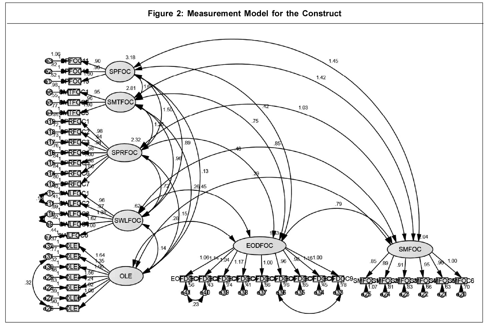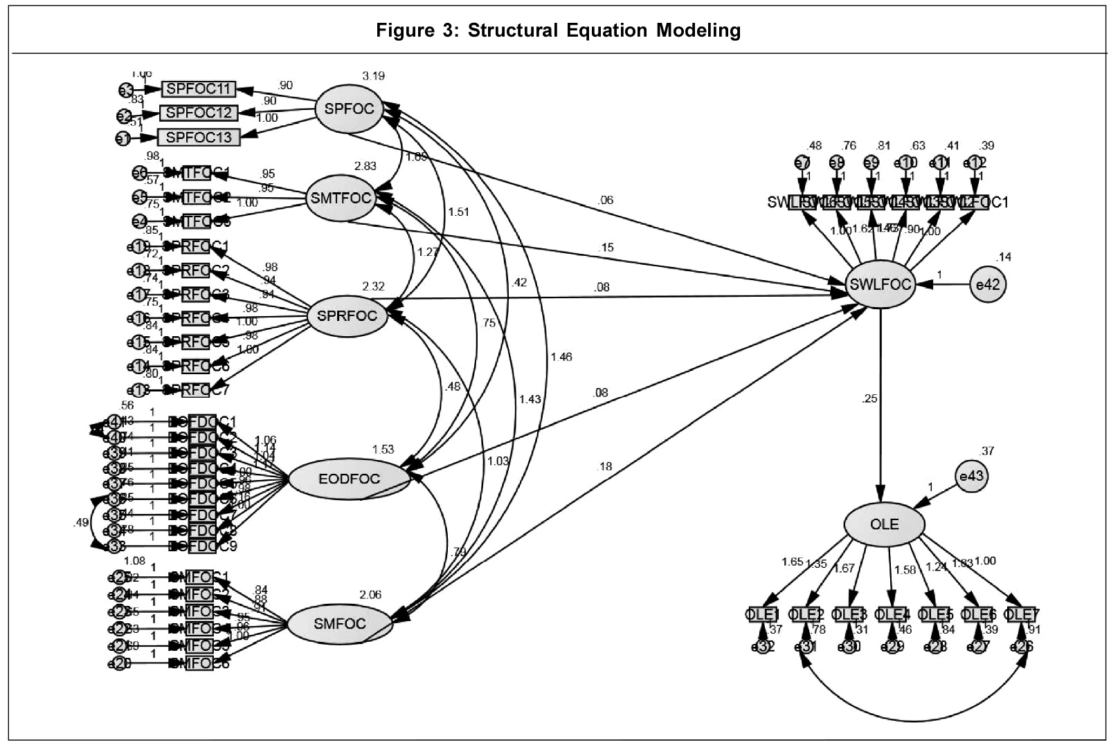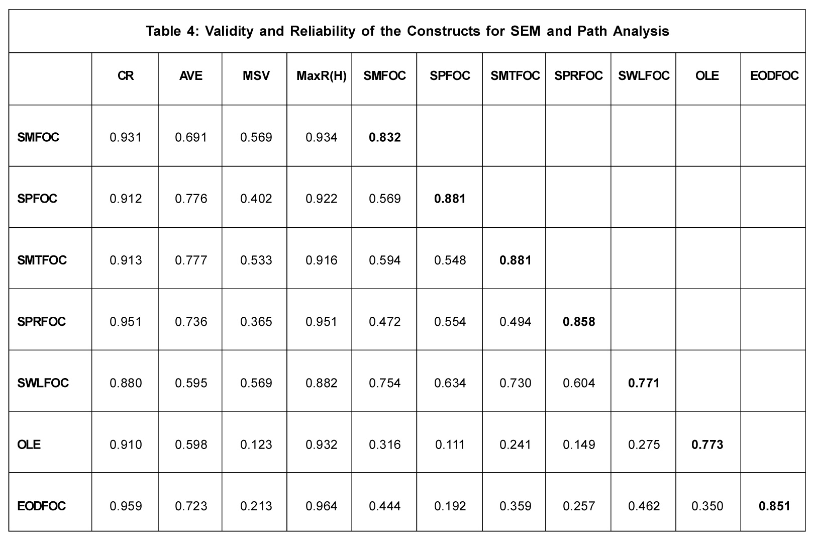 The reliability of the constructs used in the research instruments was assessed with Cronbach alpha of 0.930 for SMFOC, 0.911 for SPFOC, 0.912 for SMTFOC, 0.951 for SPRFOC, 0.961 for EOFDOC, 0.896 for SWLFOC and 0.911 for OLE (Table 3). All the Cronbach alpha values are accepted and reliable for further studies as the values are more than 0.7, as per the recommendations of Coakes and Steed (1997) and Pallant (2001).