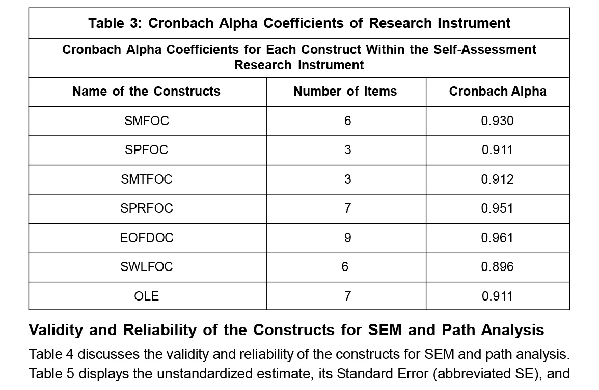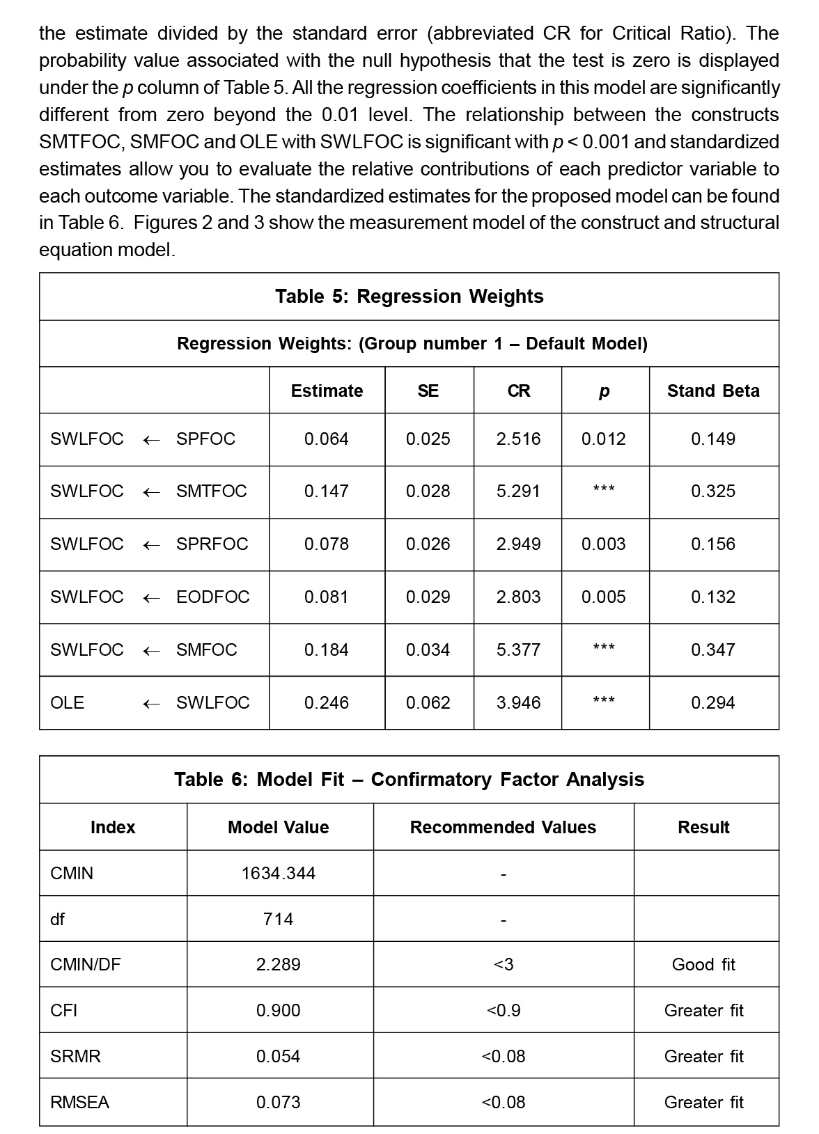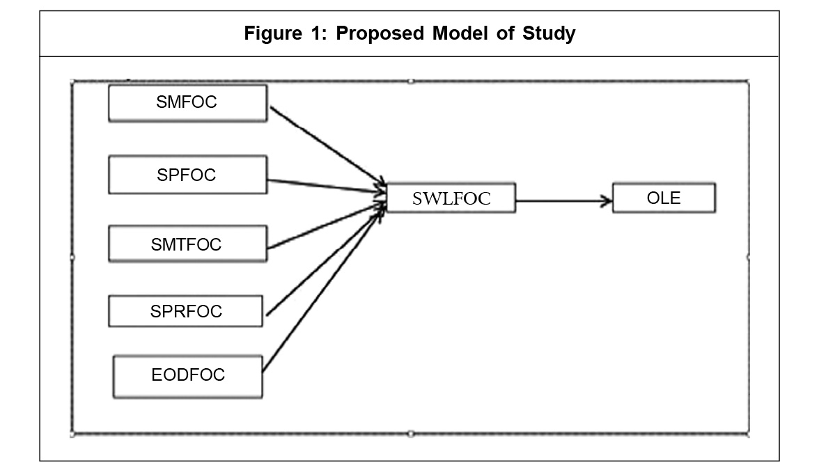 The reliability of the constructs used in the research instruments was assessed with Cronbach alpha of 0.930 for SMFOC, 0.911 for SPFOC, 0.912 for SMTFOC, 0.951 for SPRFOC, 0.961 for EOFDOC, 0.896 for SWLFOC and 0.911 for OLE (Table 3). All the Cronbach alpha values are accepted and reliable for further studies as the values are more than 0.7, as per the recommendations of Coakes and Steed (1997) and Pallant (2001).