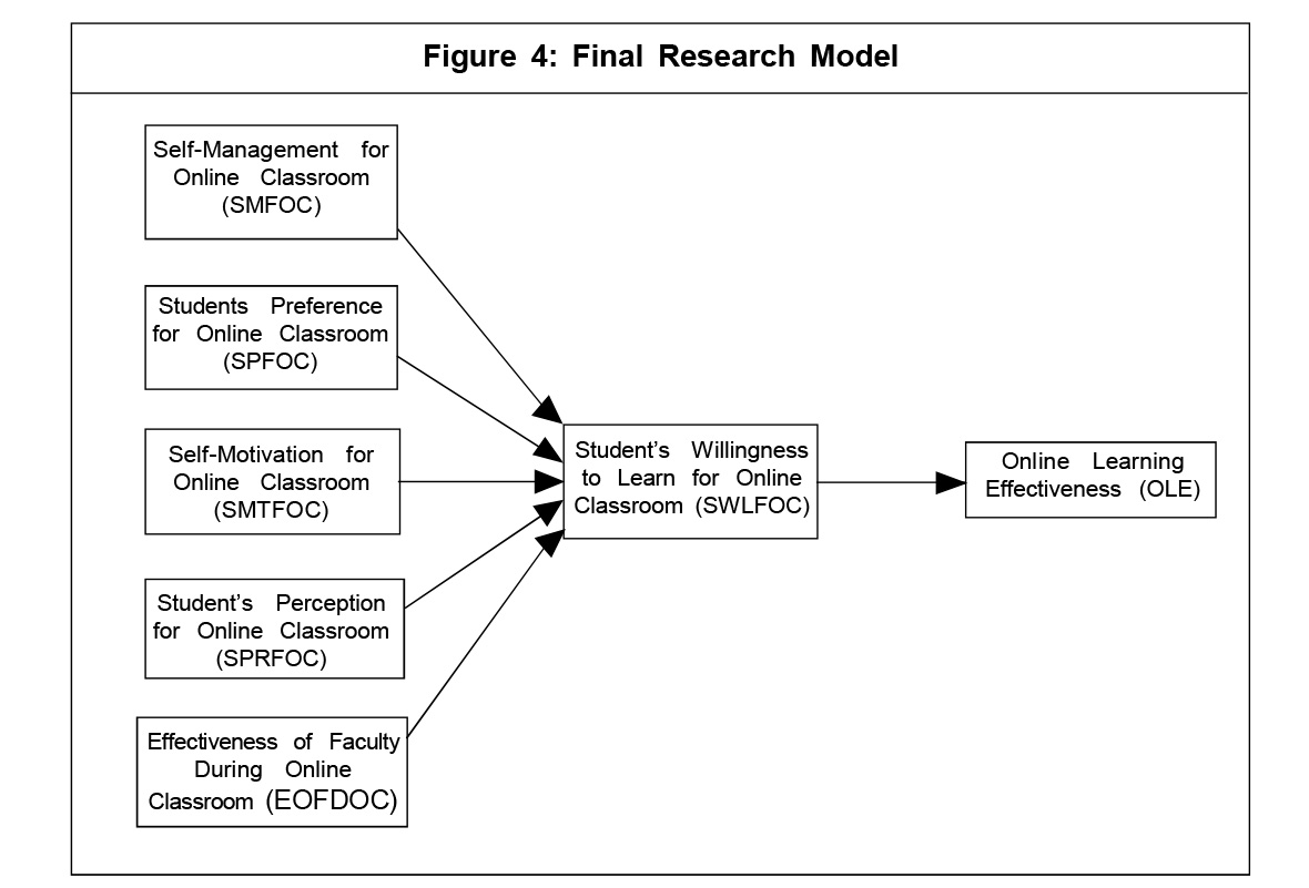 The relationships between Student's Preference for Online Classroom (SPFOC), Self-Motivation for Online Classroom (SMTFOC), Student's Perception for Online Classroom (SPRFOC), Effectiveness of Faculty During Online Classroom (EOFDOC) and Self-Management for Online Classroom (SMFOC) and Student's Willingness to Learn for Online Classroom (SWLFOC) are positive and all the independent variables are positively related to the mediating variable. We also found that SWLFOC is significantly related to OLE.