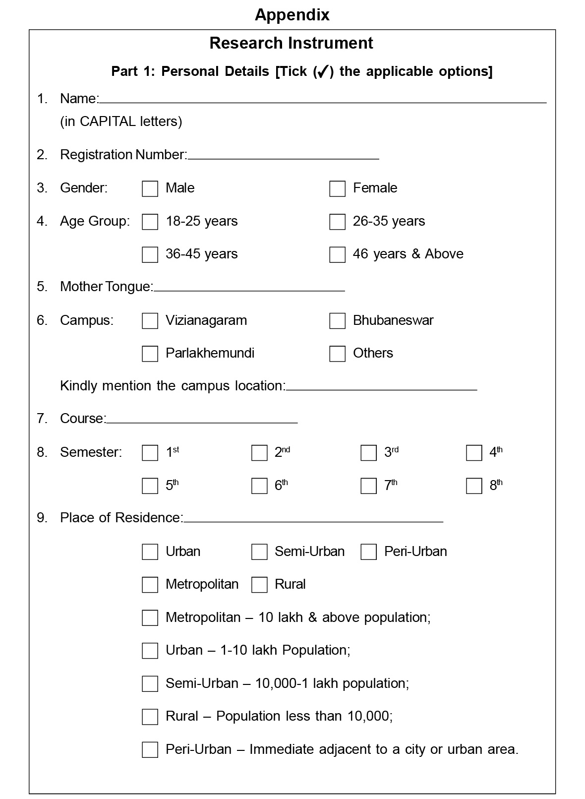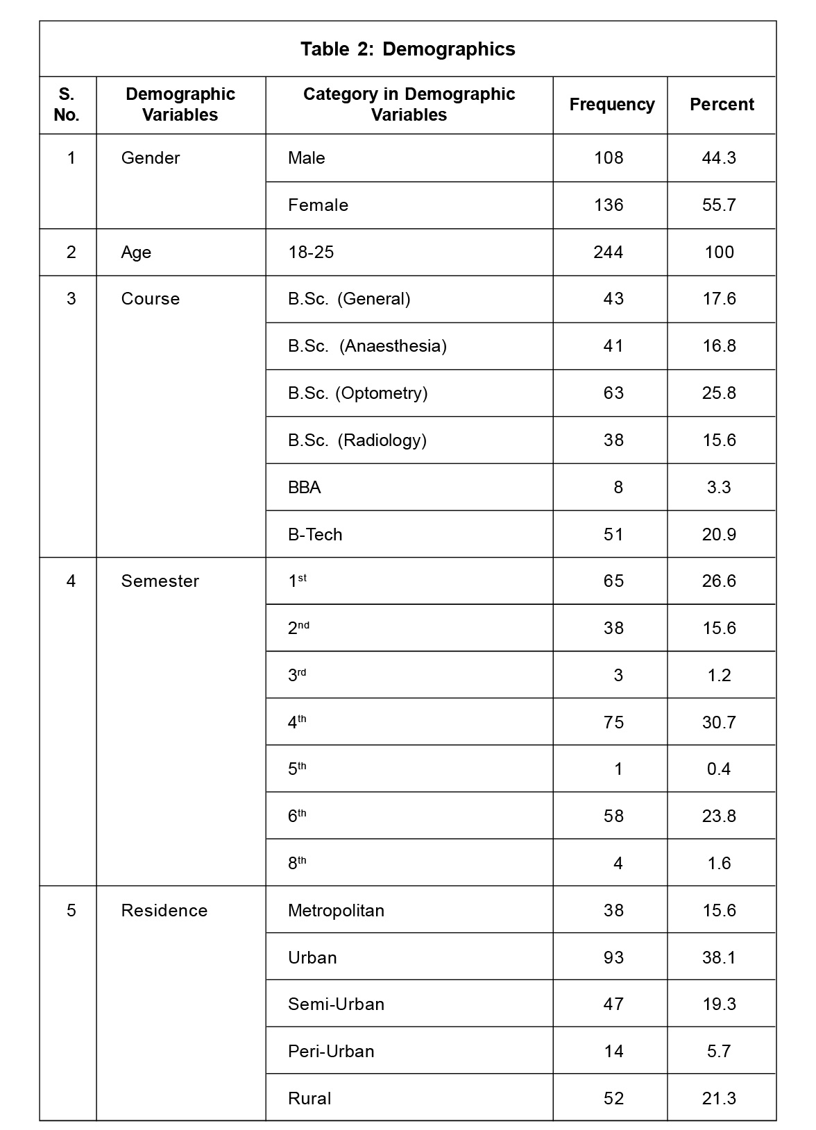 Students of Centurion University of Technology and Management of Vizianagaram campus, enrolled for full-time course like B.Sc (General), B.Sc. (Radiology), B.Sc. (Anaesthesia) and B.Sc. (Optometry), B-Tech and BBA, were the respondents. All the students were chosen to avoid any special course effect. The author collected 244 samples through convenience sampling.