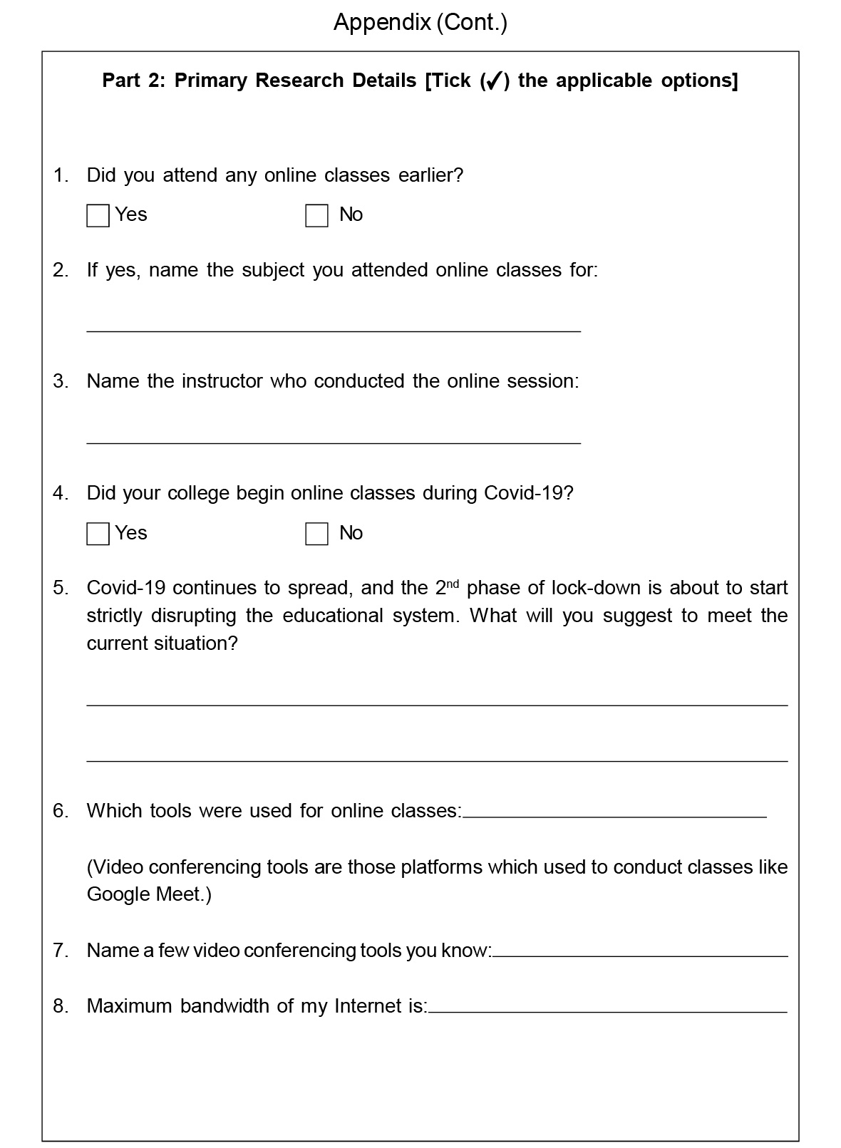 The pandemic and the subsequent lockdown forced the faculty across India to briefly shut, and this unprecedented move had created an enormous gap within the education system, despite the best of efforts of the central and state governments to ensure support for e-learning and online education (Asian News International, April 9, 2020). Since the country was under lockdown, e-education was the most effective bet left. University colleges opened accounts on online video-conferencing platforms such as Adore Zoom (G2), Ekstep, Lark, Ding talk, Google Classroom, Skype (India Today Web Desk, August 21, 2020), Cisco Webex Meetings, Abode Connect, Schoology, Blackboard Collaborate, Panopto, Touvuti LMS. Top Hat, LearnCube, BigBlueButton, Walkabout Workplace, Vedamo Virtual Classroom, Wiziq, Samba Live, TutorRoom, BrainCert, K-12 Online, HowNow, Blik Session, Agora, Airstack, AyoTree, ClassIn, Electa, Elvis Virtual Classroom, Koala Online Classroom, Newrow Smart, and SimpleHelp VCR (G2), to interact with students (ET Government, May 20, 2020).