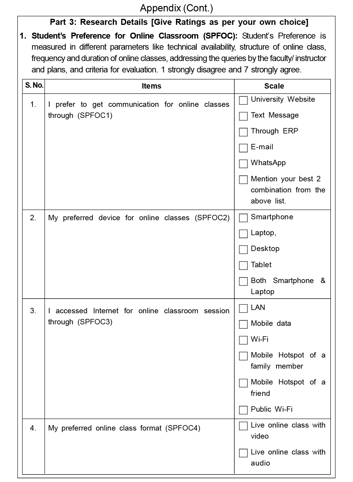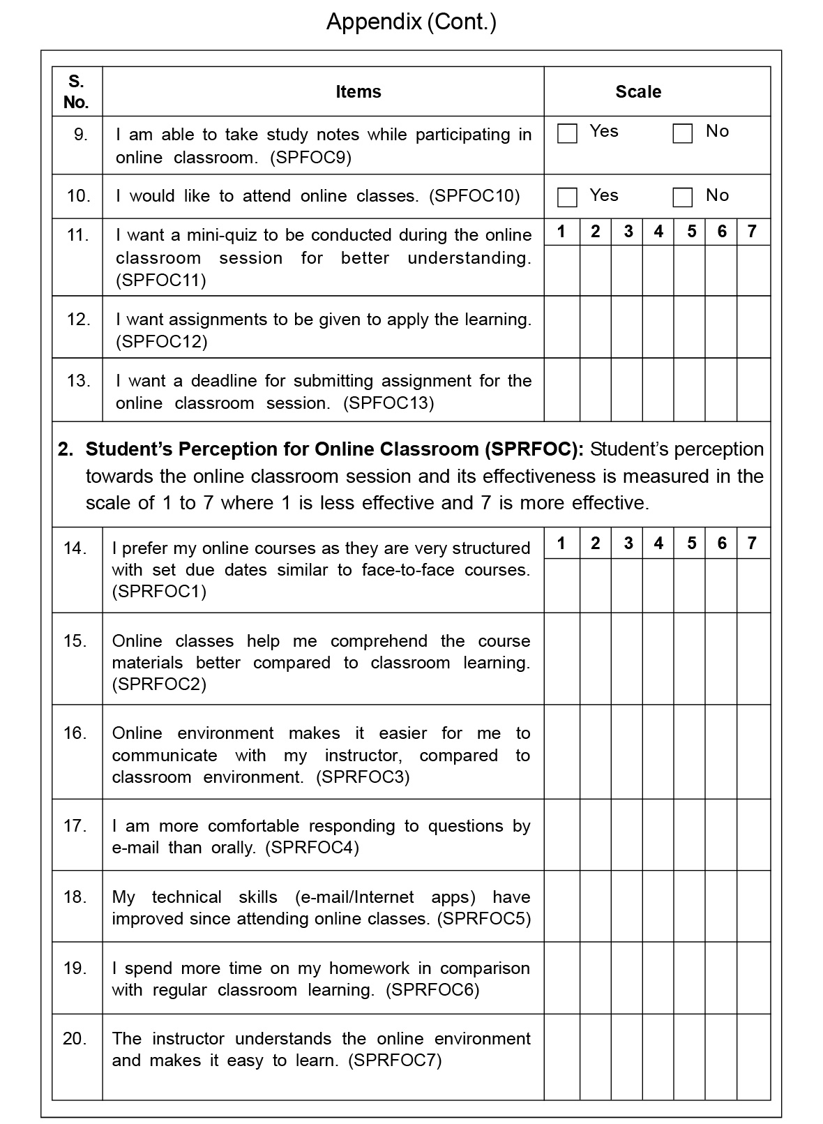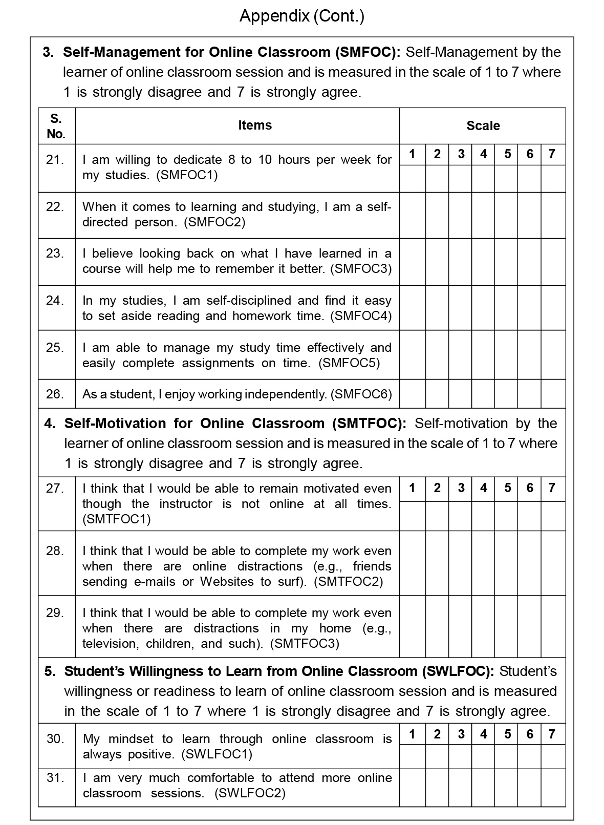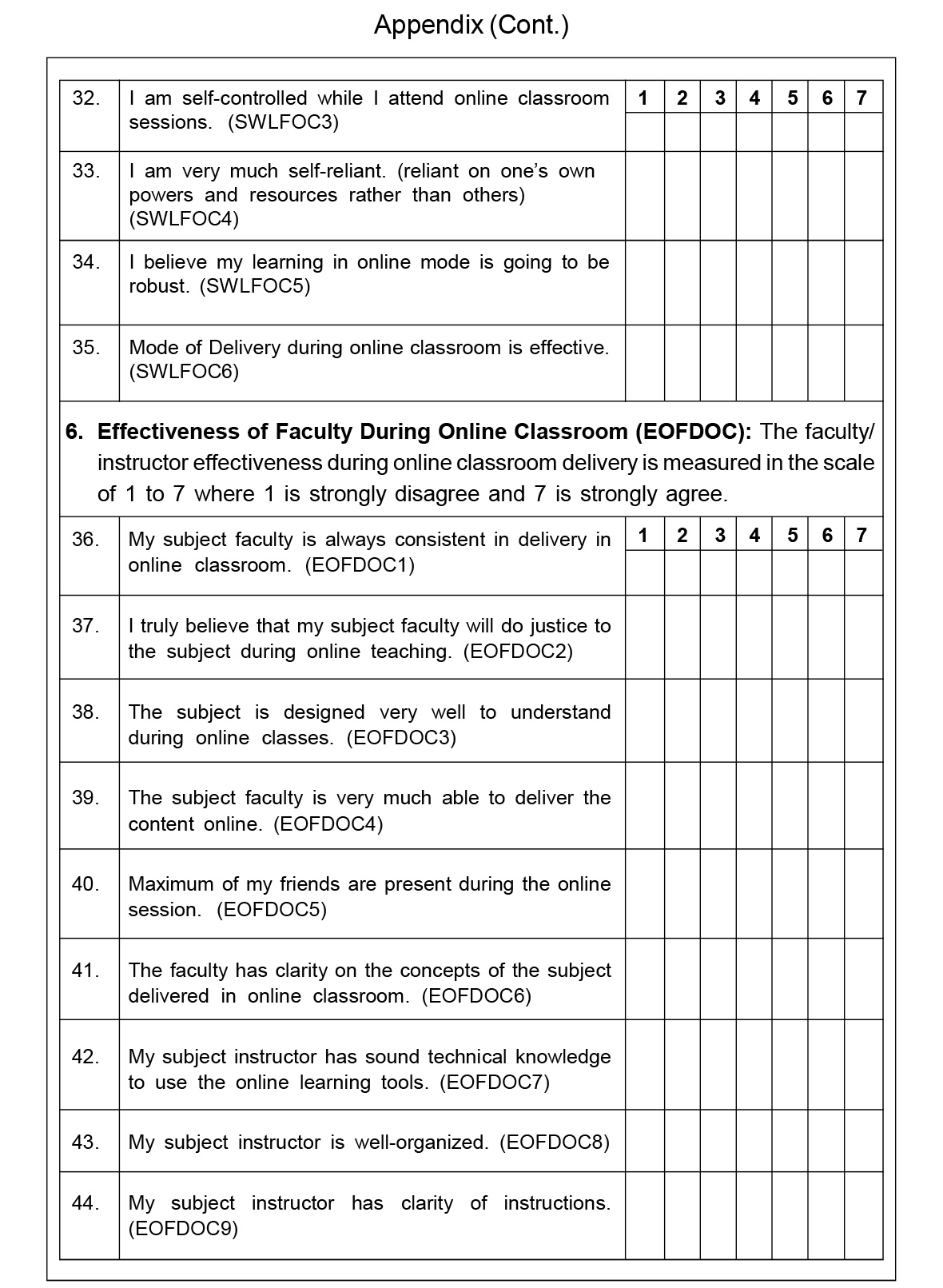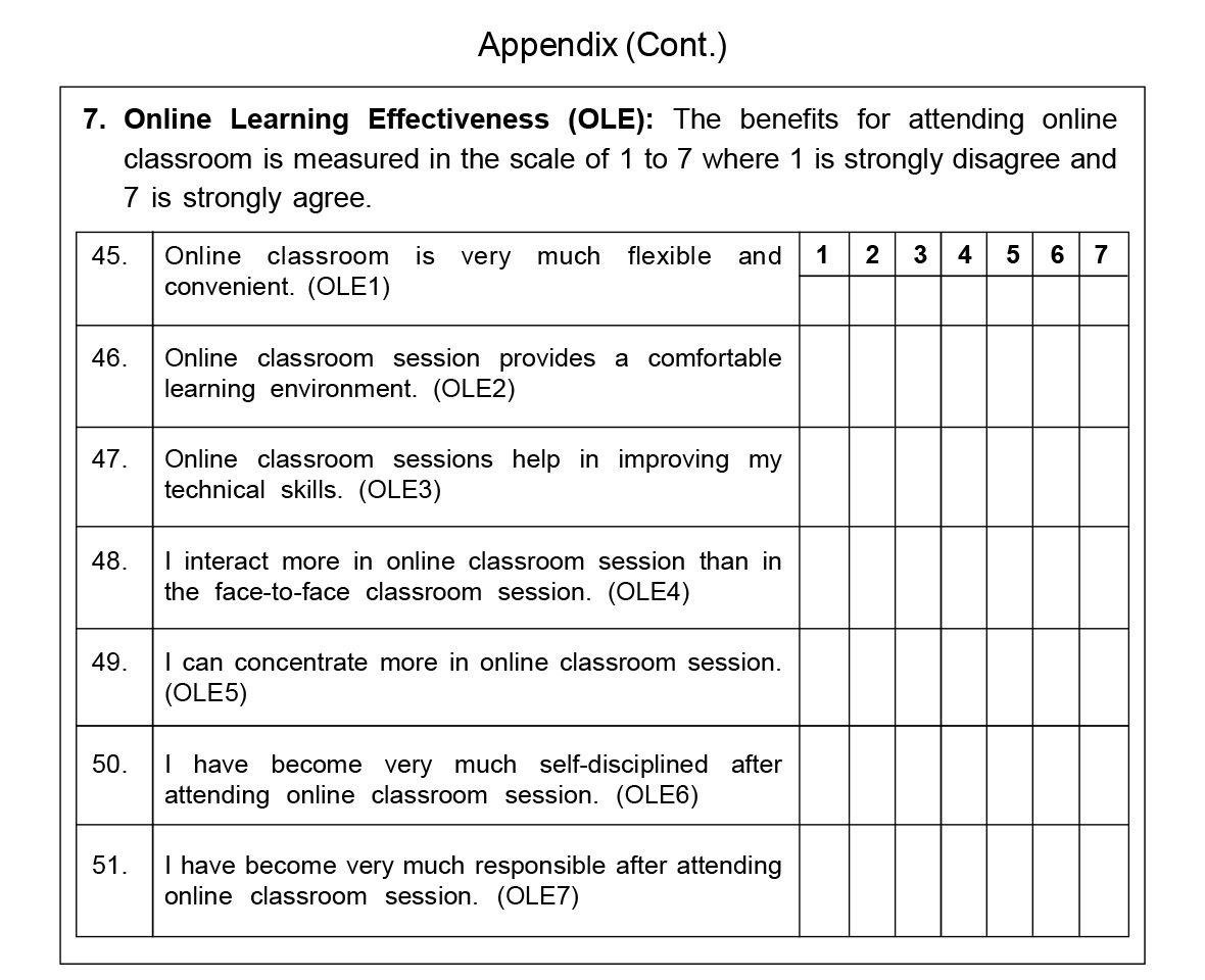 Research instruments were converted to online Google Form for simplification. The research instruments were thoroughly cross-checked for grammatical mistakes and for easy understanding by the students. The author preferred a non-probability convenience sampling method to collect data. The questionnaire (see Appendix) was responded to by the students on a 7-point rating scale, where 1 represents Strongly Disagree and 7 represents Strongly Agree.
