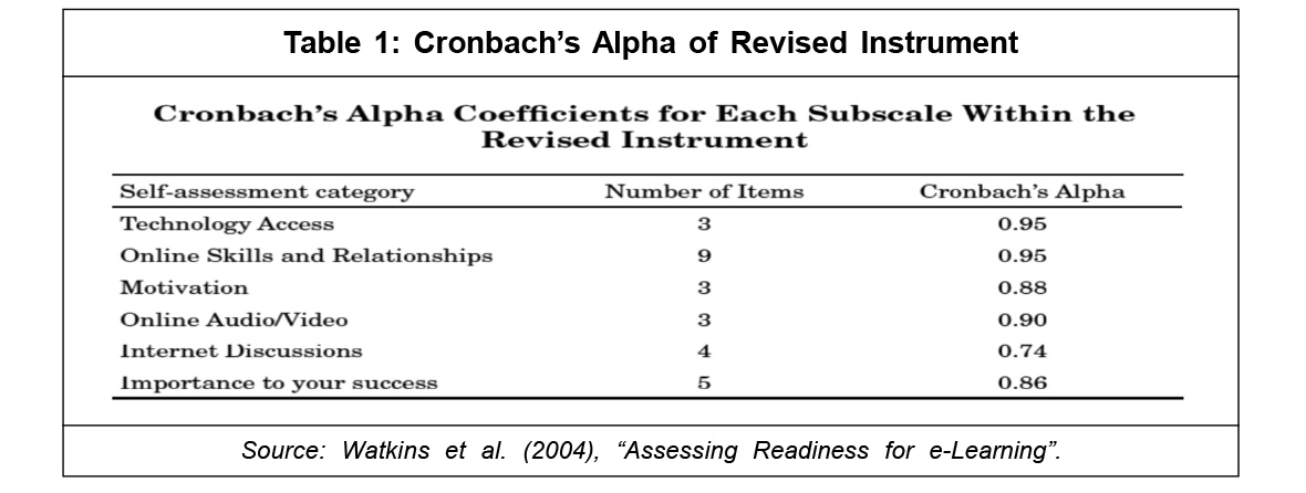 Watkins et al. (2004) developed an instrument earlier with 10 different scales, viz., Technology Assess, Technology skills, Online relationships, Motivation, Online Readiness, Online Video/Audio, Internet chat, Discussion boards, Online groups, and Importance to your success, with a sum total of 40 items and later on recommended only 6 factors and 27 items for the instrument (Table 1).