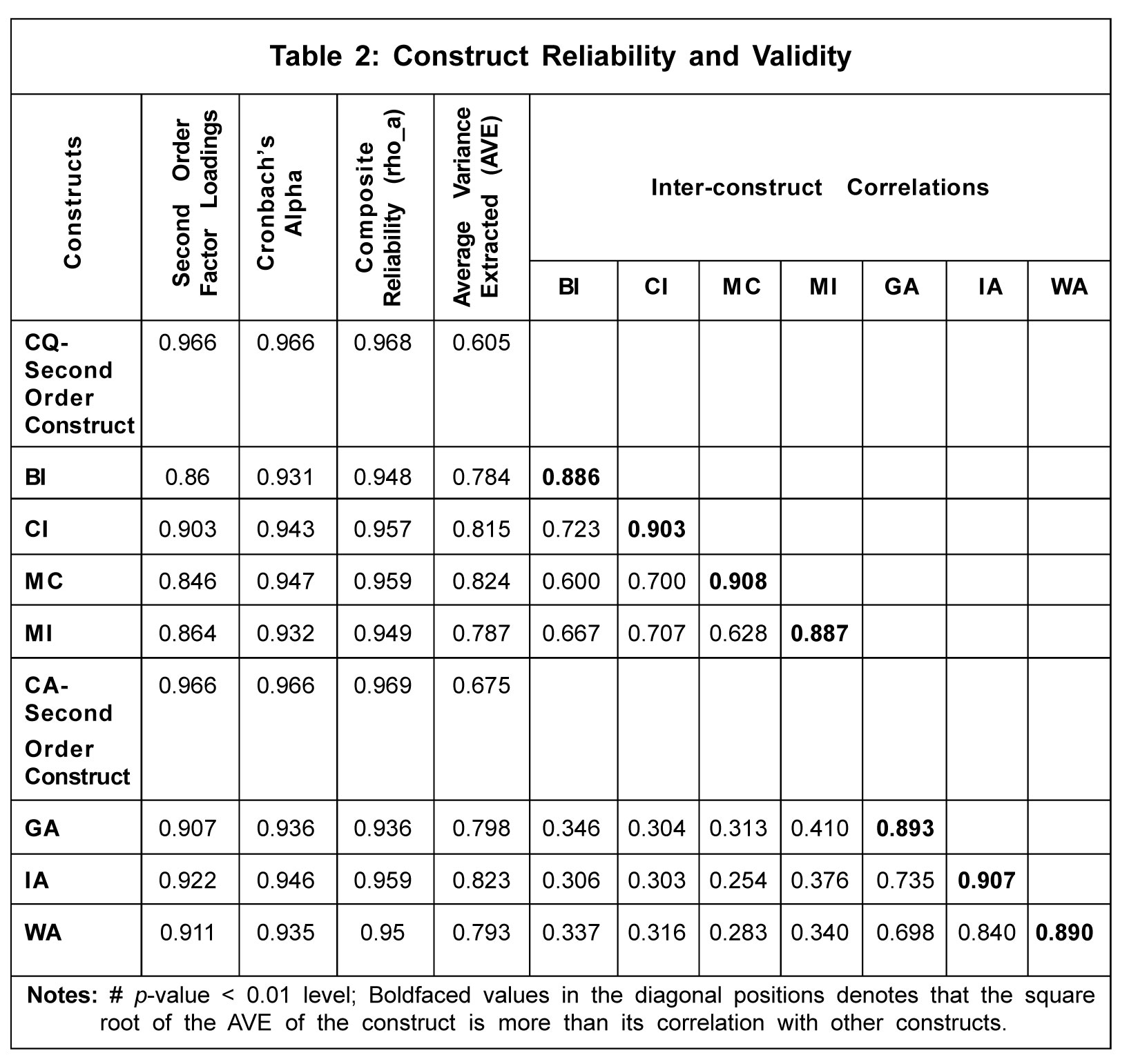 MI = 0.787, GA = 0.798, IA = 0.823, and WA = 0.793) and second order constructs (CQ = 0.605 and CA = 0.675) have AVE values greater than the cut-off point of 0.5. Additionally, the discriminant validity of the first order constructs employed in the study was examined using the Fornell-Larcker criterion. All of the first order constructs have square root of AVE values that are greater than their corresponding inter-correlations with the other constructs employed in the study.