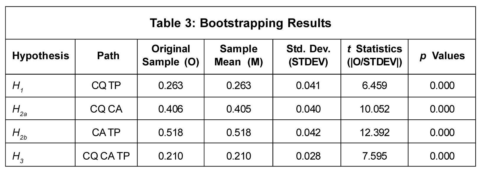 constructs account for 55.2% (or a moderate degree) of the variation in task performance. Through the partial mediation of CA, CQ has a statistically significant positive indirect effect on TP (0.210) that is significant at 1% level. The direct positive link between CQ and TP is shown in hypothesis H1 (b = 0.263, t = 6.459, p = 0.001), and this direct relationship is partially mediated by CA (b = 0.210, t = 7.595, p = 0.001) at 1% significance level.