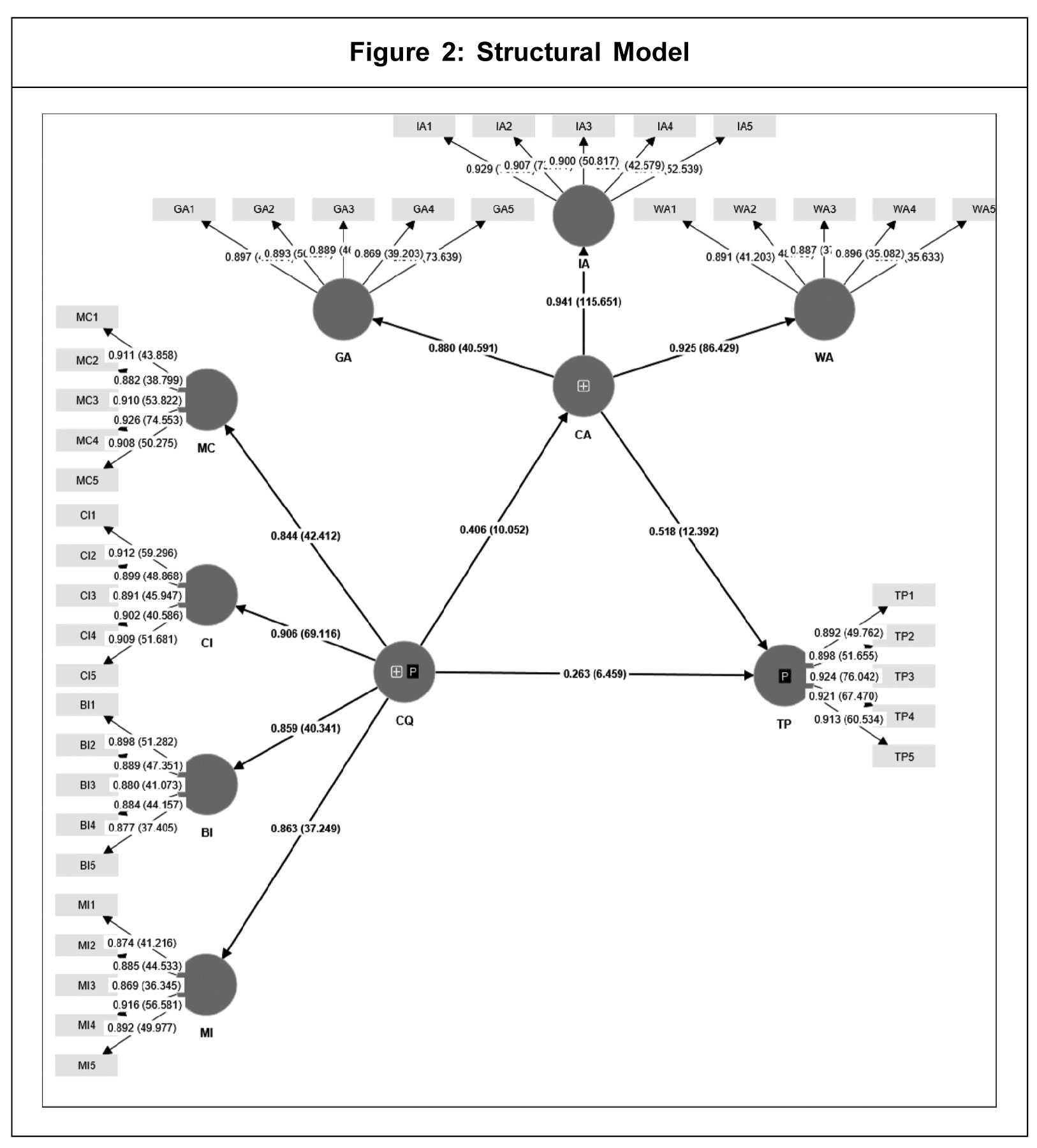 The constructs' reliability was examined using Cronbach's alpha and composite reliability values. The reliability of the constructs utilized in the study is supported by Cronbach's alpha and composite reliability values that are higher than the cut-off point of 0.70 (Hair et al., 2017). The threshold value of 0.7 for Cronbach's alpha is exceeded by all first order constructs (BI = 0.931, CI = 0.943, MC = 0.947, MI = 0.932, GA = 0.936, IA = 0.946, and WA = 0.935) and second order constructs (CQ = 0.966 and CA = 0.966). The reliability of all the constructs is demonstrated by the fact that all first order constructs (BI = 0.968, CI = 0.957, MC = 0.959, MI = 0.949, GA = 0.936, IA = 0.959, and