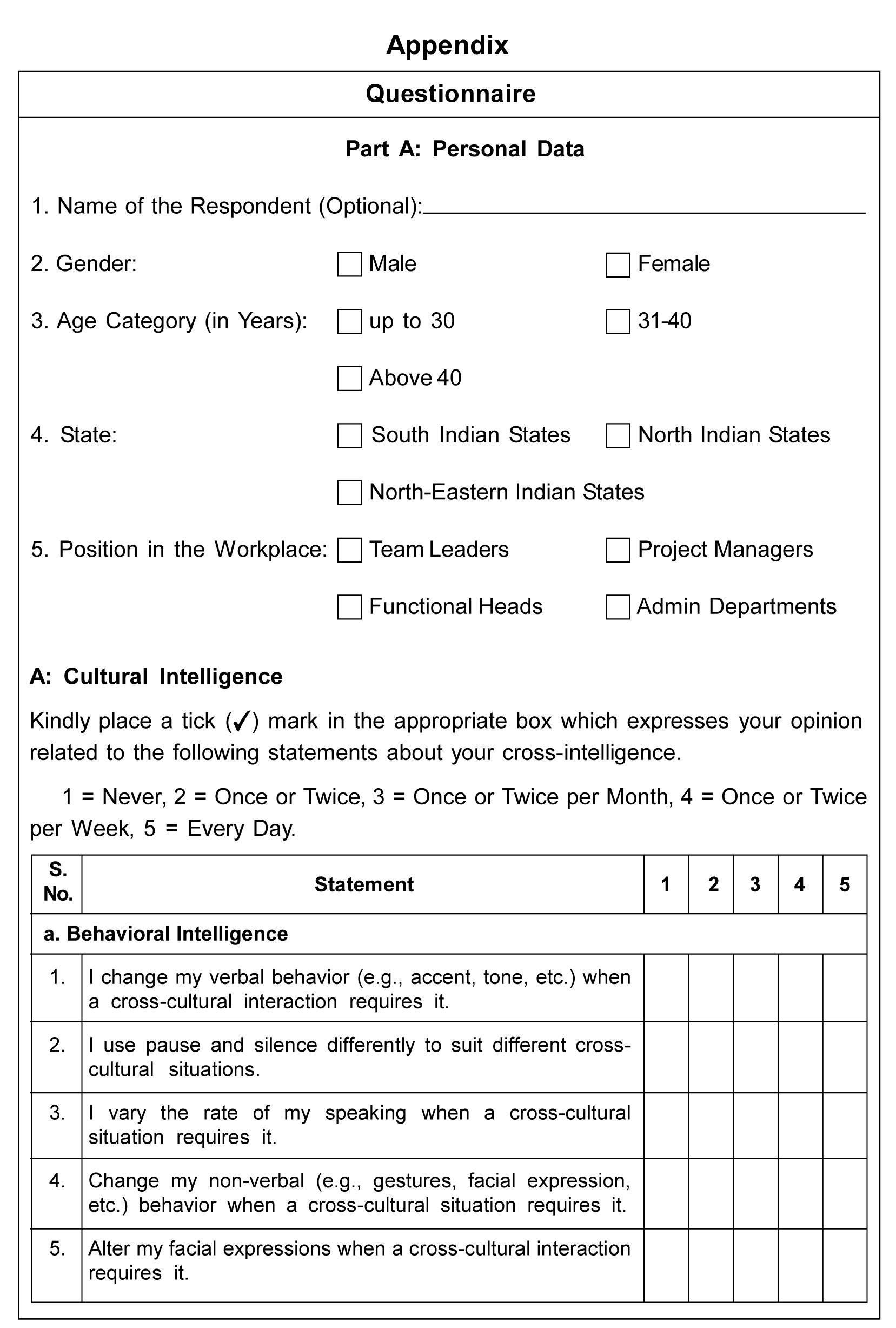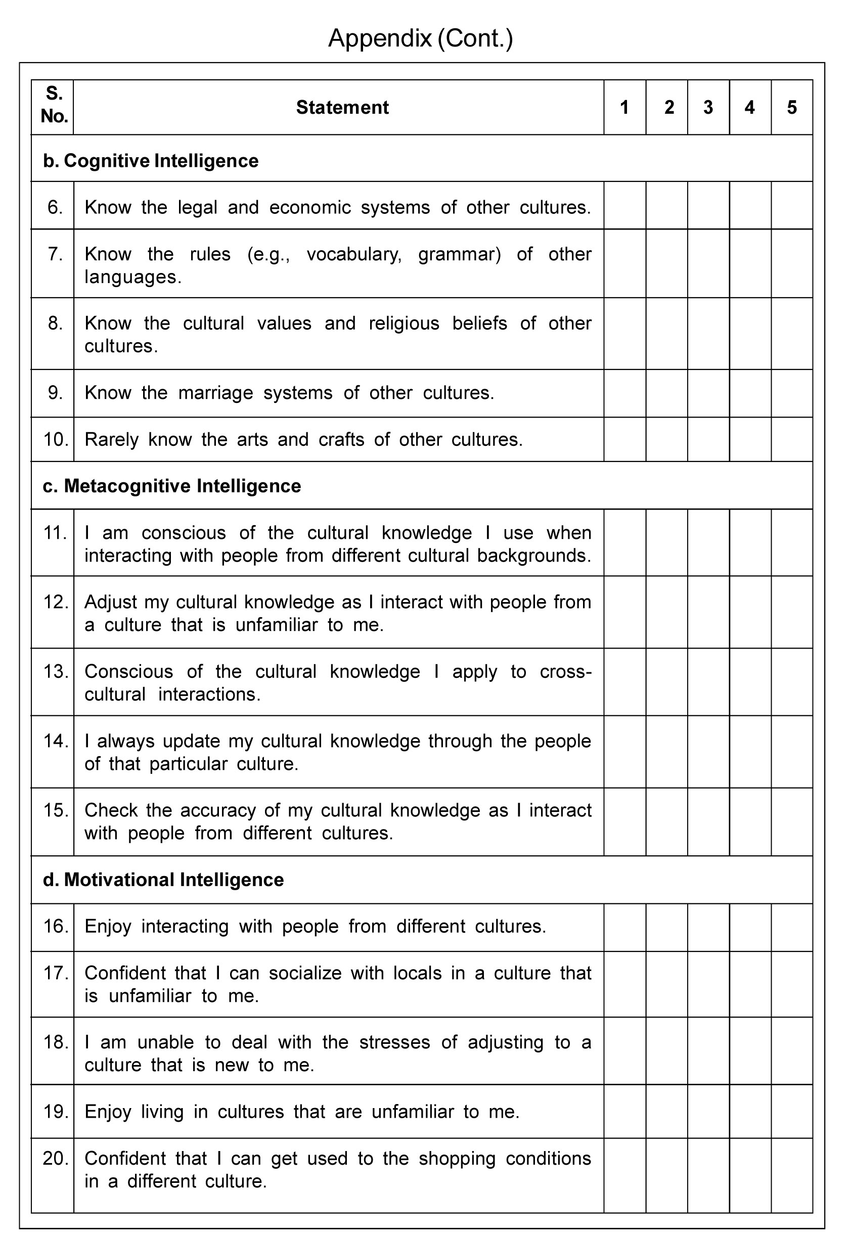 Hence, the study has focused only on one result of cultural intelligence, i.e., task performance. In the future, more results can be focused on, such as the effectiveness of leadership and culture, organizational commitment, etc., for an improved understanding of the CQ theory. Next, the study has not examined any antecedents of cultural intelligence such as social intelligence, personality traits, emotional intelligence, etc., therefore, future research can be carried out by taking up these antecedents.