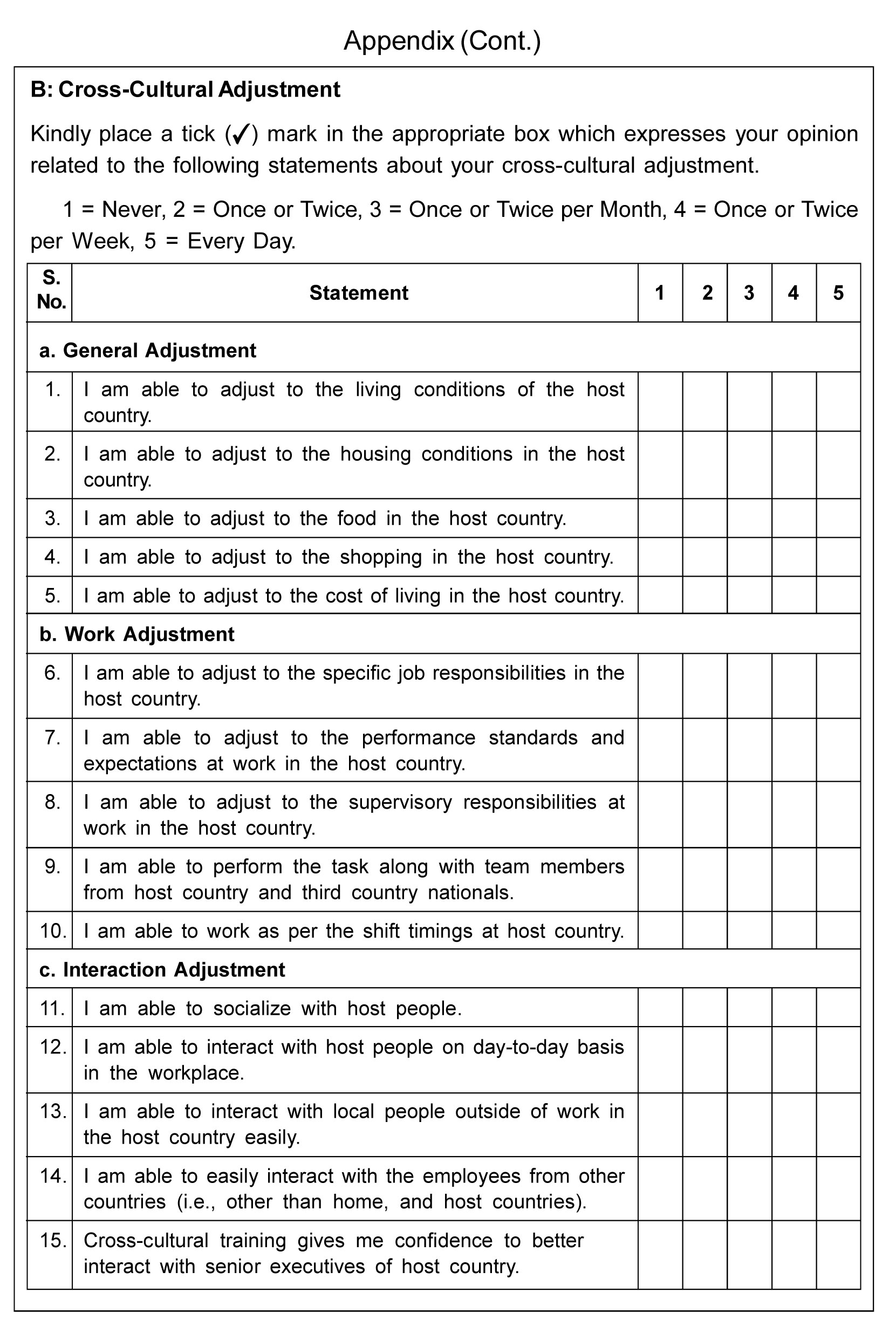 alpha of the scale was 0.794. The sample items included "Adjust myself to the conditions in state where I am posted" (Black and Porter, 1991).