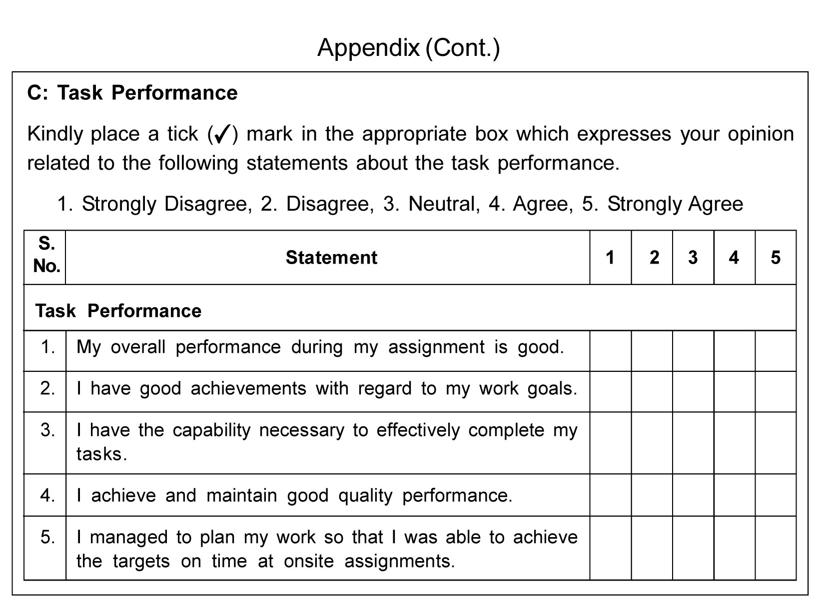 TP is the function of knowledge, skills, talents and inspiration directed towards individuals' prescribed role behavior, such as formal task accountabilities (Campbell, 1999). TP comprises all behavior and skills required by an employee for carrying out the working procedure, and also denotes the knowledge and evidence about the principles associated with work performance (Bess, 2001).