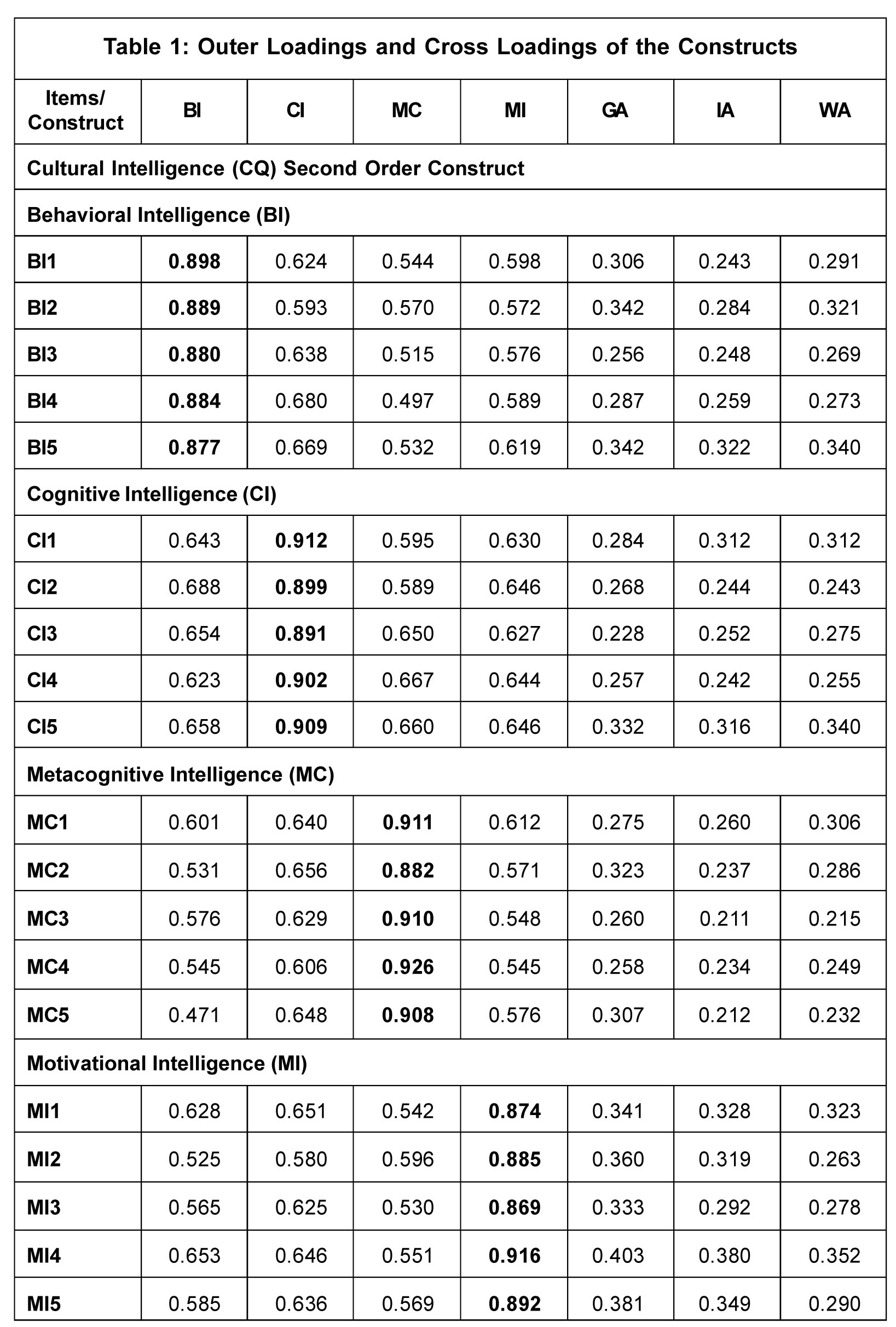 The outer and cross loadings of each item in the first order structures are listed in Table 1. Convergent and discriminant validity were used to evaluate the measurement model's construct validity. The scale's convergent validity was confirmed by computing outer and cross loadings, as indicated by Hair et al. (2017). The cross loadings of all the items were found to be less than their outer loadings, confirming the scales' convergent validity as proposed by Hair et al. (2017). The outer loadings of all the items are all greater than the threshold value of 0.5. The Average Variance Extracted (AVE) value of the constructs was another indicator of the convergent validity of the constructs. The AVE value of each construct utilized in the current investigation exceeded the cutoff value of 0.5, as advised by Hair et al. (2017), establishing the convergent validity of the constructs.