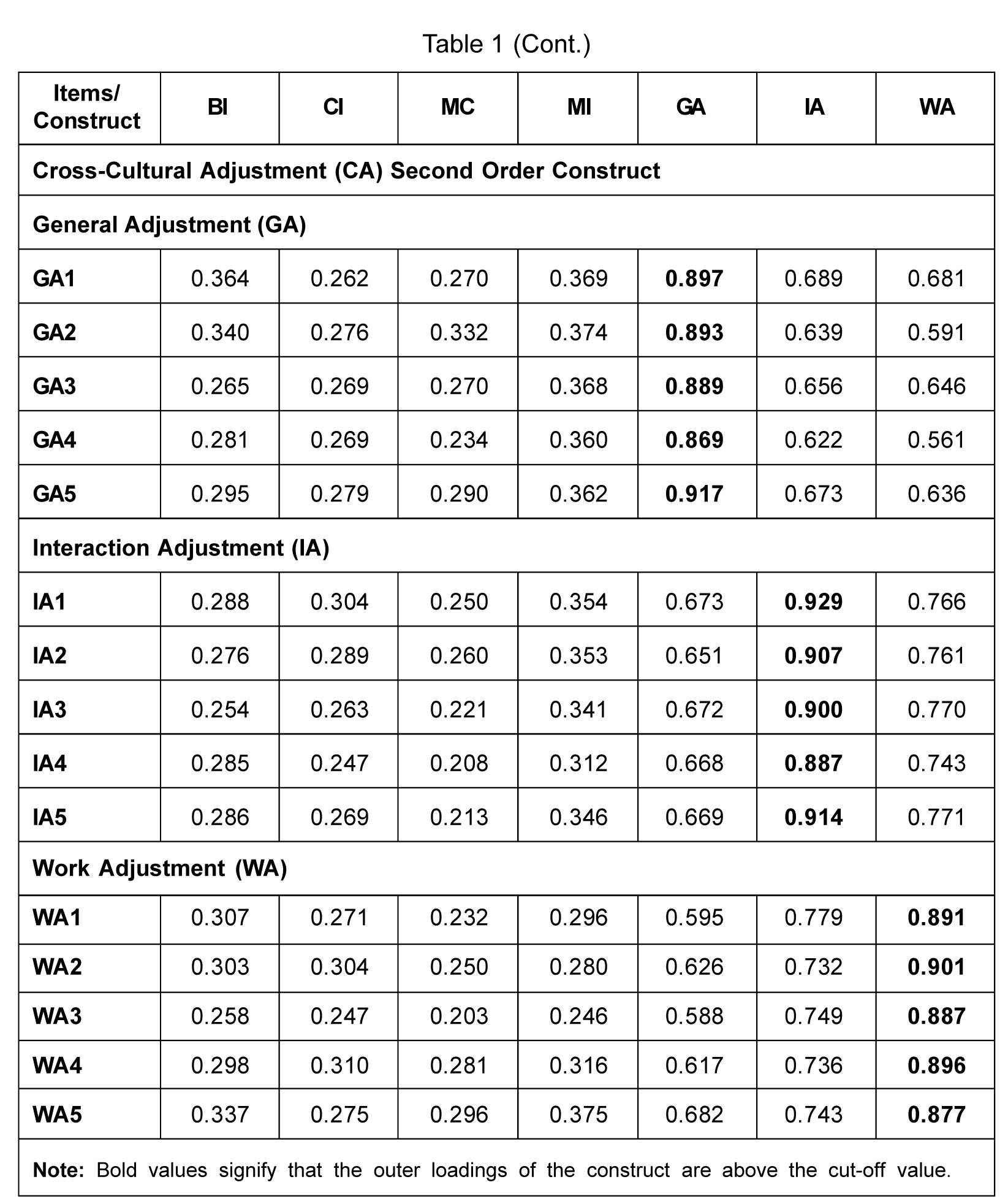 TP Scale: Four items of the Expatriate Performance scale, developed by Black and Porter (1991), was adopted to measure the TP. Cronbach's alpha of the scale was 0.839. The sample item included "My overall performance during my assignment is good" (Black and Porter, 1991).