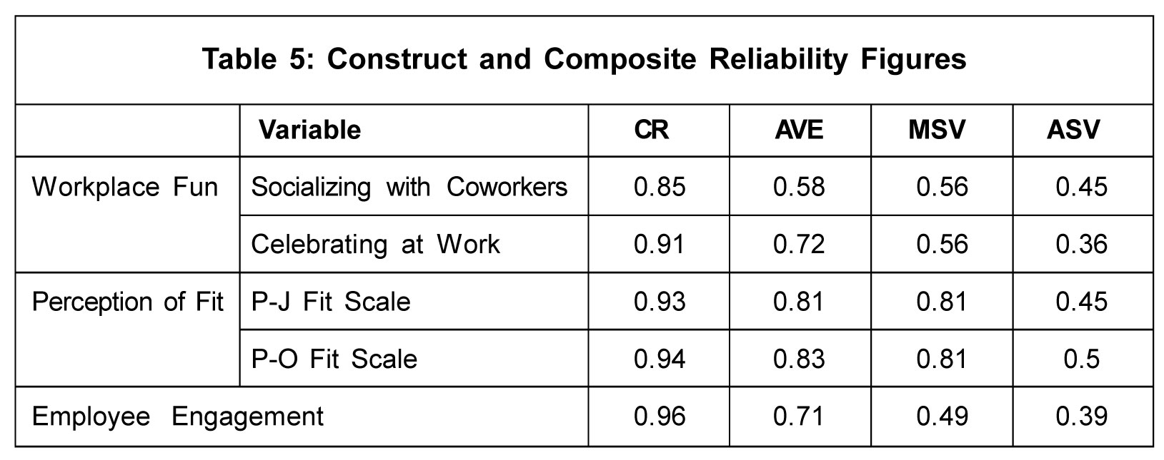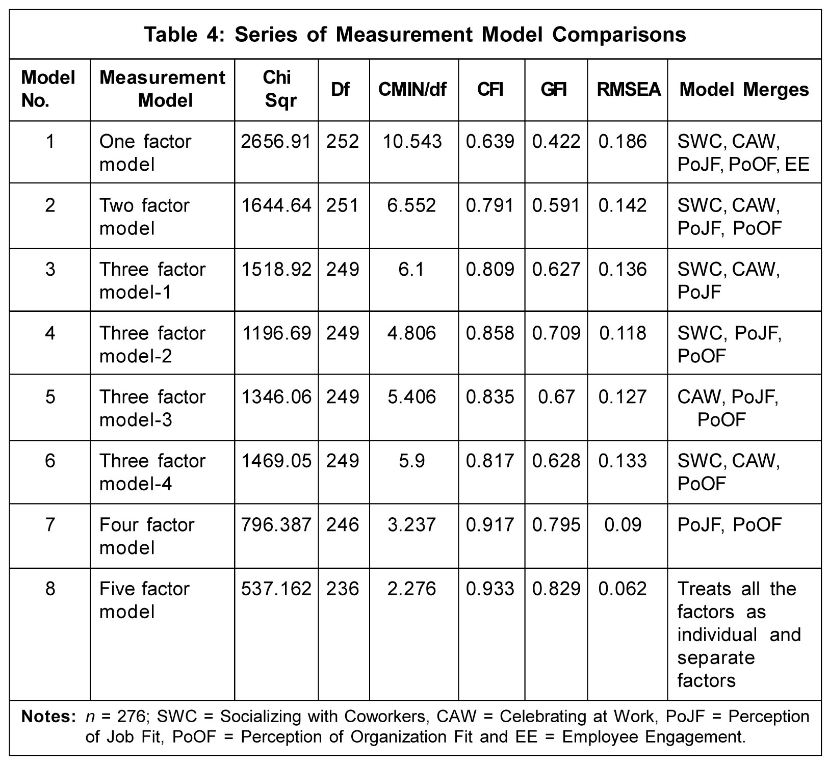 the five components separately, i.e., Socializing with coworkers, Celebrating at work, Perception of Job Fit, Perception of Organization Fit and Employee Engagement fit the data well with following indices/parameters: c2 = 537.162, df = 236, CMIN/df = 2.2796 (< 5.0; (Wheaton et al., 1977)), CFI = 0.933 (≥ 0.90; (Bentler, 1990)), GFI = 0.829 (Doll et al., 1994; and Baumgartner and Homburg, 1996), and RMSEA = 0.062 (< 0.07; (Steiger, 2007)). All indicators of model fitness were found to be statistically significant with factor loadings (p < 0.01) reporting convergent validity (Anderson and Gerbing, 1988). Then discriminant validity was tested in several ways.