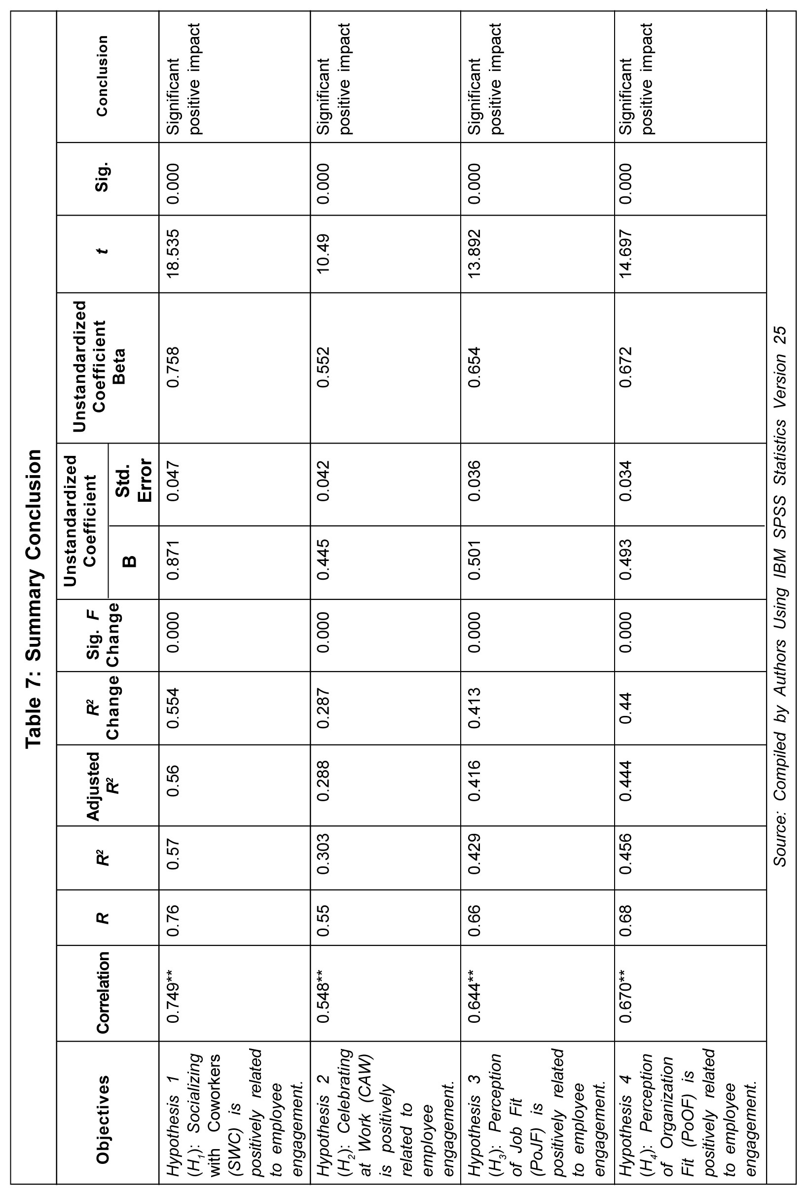 Further, the results of multiple regression analysis model reports Celebrating at Work (CAW) contributes 28.7% towards EE (R2 Change = 0.287), which shows significant contribution (Sig. F Change = 0.000). Coefficients table shows CAW has a significant positive impact on EE (p < 0.005, Beta = 0.552, t = 10.490). With this, H2 is also accepted, i.e., CAW is positively related to work engagement (Table 7).