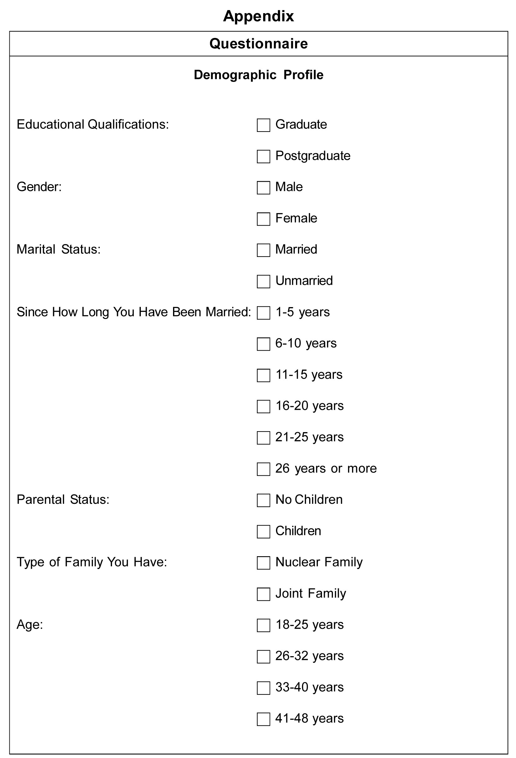 Prior studies in the field of engagement (Mohapatra and Sharma, 2010; Banihani et al., 2013; Madan and Srivastava, 2015; Shukla et al., 2015; Chaudhary and Rangnekar, 2017; Marcus and Gopinath, 2017; and Hasanati, 2018) demonstrated gender, educational qualifications, age, marital status and type of family can be potential predictors of study criteria. Based on these studies, gender, age, educational qualification, type of family and marital status are used as control variables for the study.