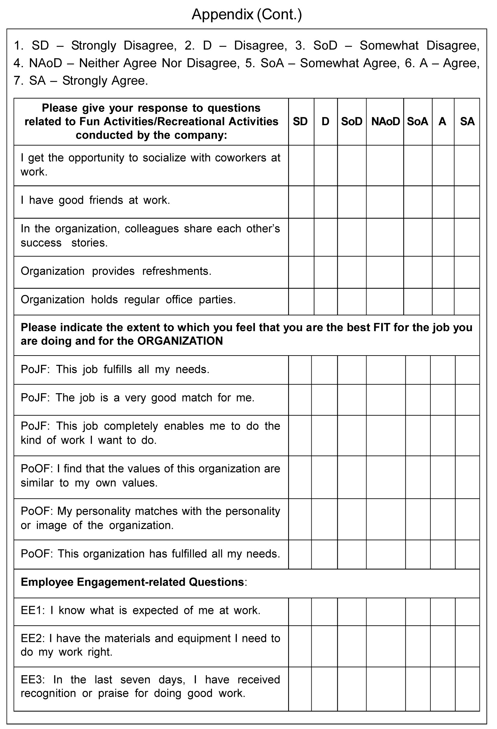 Previous studies have drawn various conclusions regarding the role and relevance of perception of fit and workplace fun. Overall these two components seem to contribute favorably to employee engagement. Yet, the limited studies available in the Indian context justifies the rationale for the current study. The study aims to explore whether perception of fit and workplace fun have any correlation with employee engagement in Indian services sector companies. The relationship between employee engagement and perception of fit and workplace fun has relevance for the post-pandemic world too (Negi et al., 2023). The rapid pace of technological innovation, expanding subtleties of business management, pressure to become a world-class organization, and relative paucity of employees with relevant skills have all contributed to challenges associated with attracting, sustaining, and leveraging talent in most organizations around the world.