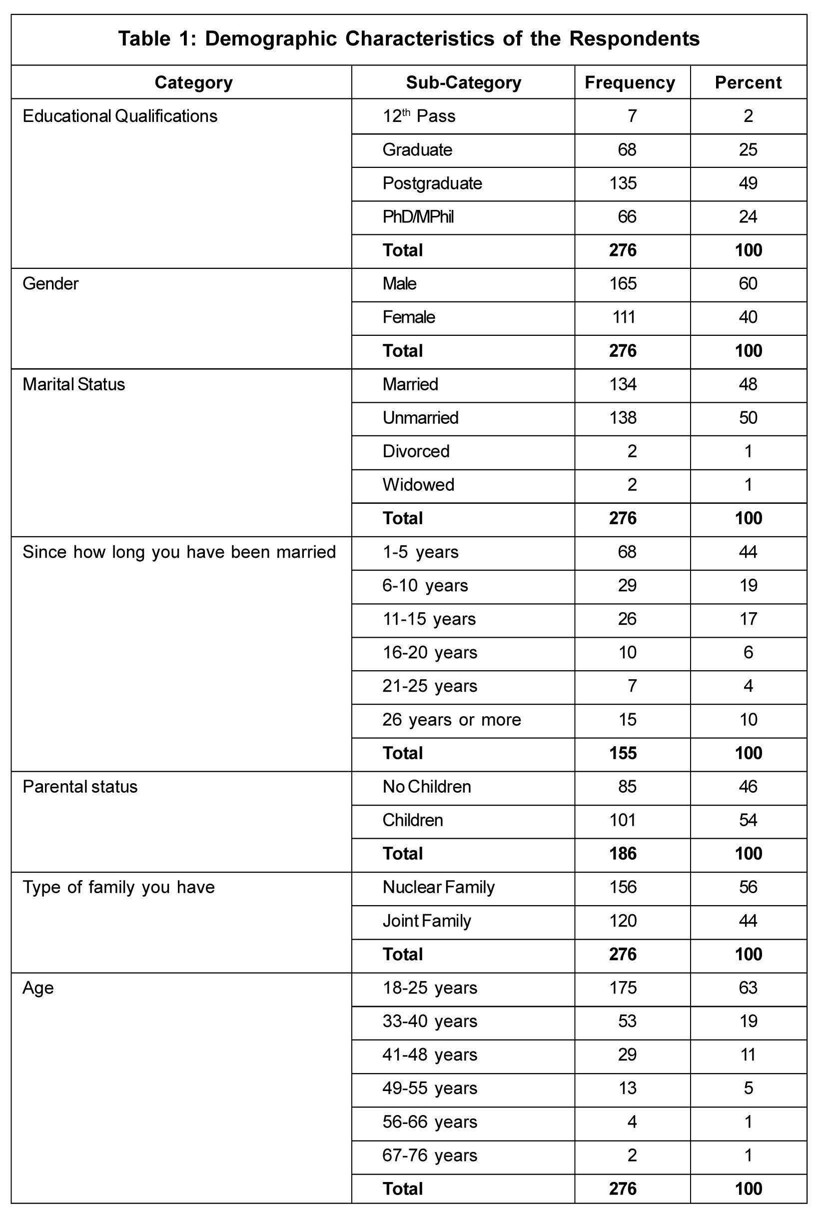 Table 1 lists the demographic characteristics of the respondents. The sample comprised 60% males, and 40% females. With respect to their educational qualification, the maximum number of respondents belonged to the postgraduate category (49%), followed by graduates (25%), and PhD/MPhil (24%). 50% of the respondents were unmarried, 48% married, 1% divorced and 1% widowed. Of the married respondents, 44% remained married for 1 to