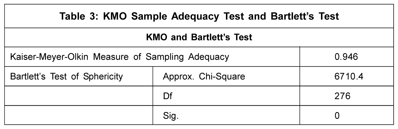 Overall Kaiser-Meyer-Olkin (KMO) and Bartlett's Test measure to verify sampling adequacy came out to be 0.946. All KMO values for individual constructs were higher than 0.729, which is well over the acceptable limit of 0.5 (Field, 2009) (Table 3).
