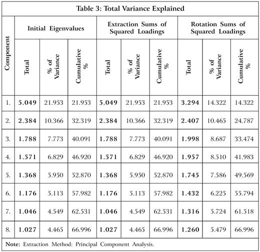 The data analysis was done using SPSS package 20.0. In the present study, the factor analysis is used to eliminate the redundant (highly correlated) variables from the data and to shrink the number of variables into definite number of dimensions or factors associated with perceived risk reduction. In order to determine whether the dataset was fit for factor analysis, Kaiser-Meyer-Olkin (KMO) and Bartlett’s test were conducted. The KMO test result was 0.723, which shows that factor analysis was applicable to the dataset. As the p value for Bartlett’s test was 0.00 or p< 0.05, the relationship between the variables was sufficient to conduct the factor analysis, the results are shown in Table 2. Responses were further treated with factor analysis using principal component analysis to spot the closely related variables. Out of a total of 23 variables, eight factors were extracted on rotation of the variables; they are shown in Table 3 with their respective factor loadings. The result of the factor analysis using principal component method depicts that 66.996% of the total variance is explained by classifying these 23 variables into eight factors.