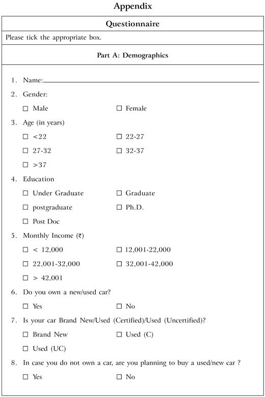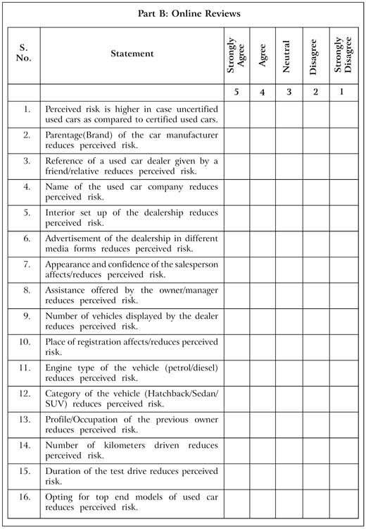 Relating to the critical state of mind of the consumer, this study attempts to identify the detailed factors and relevant aspects that aid in impacting as well as reducing the levels of perceived risk in case of an uncertified used car purchase. It also aims at assisting the consumers to reach a final purchase decision and aid the dealer to bridge the trust-gap with the consumer.
